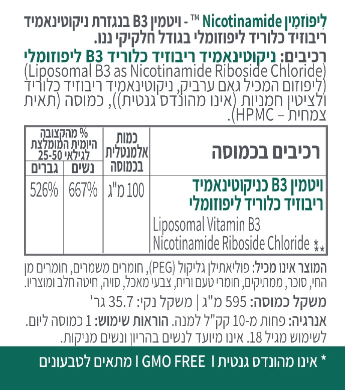 - 500 מ”ג – ניקוטינאמיד ריבוזיד ליפוזומלי .