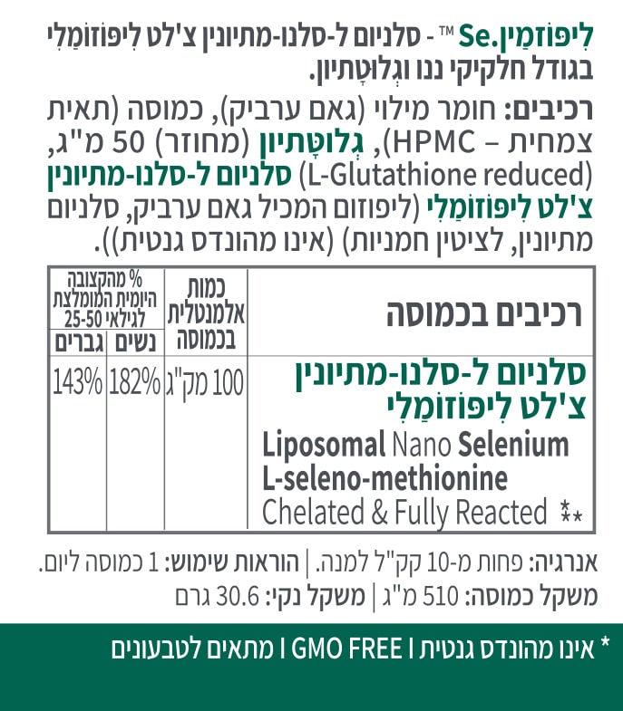 Se , שמספק 100 מק”ג סלניום מתיונין ליפוזומלי בכמוסה אחת בלבד.