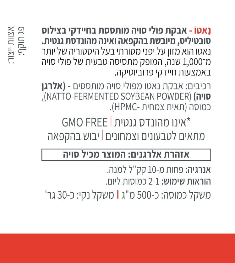 - מכיל חיידקי פרוביוטיקה מסוג בצילוס סובטיליס נאטו.
